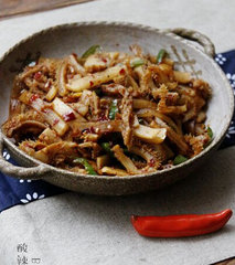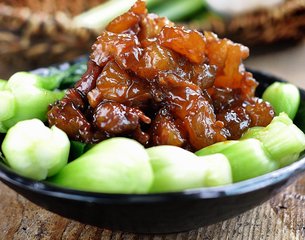 这是比较传统的家常菜,裹了甜酱的肉丝,冒着热气,在青葱味道陪伴下;刚好去腻而成味鲜的菜。此菜老人小孩都喜欢。