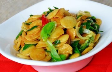 蒜苗炒豆饼:蒜苗炒豆饼是沿淮地区的特色的小吃,是农家乐里点菜率是最高的,来着旅游的人,没有不喜欢这道菜的。 蒜苗炒豆饼的做法步骤请看下面地铺行网的讲解。