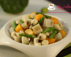 田园小炒的主要食材是:莲子、藕丁、南瓜和芦笋。莲子,具有防癌抗癌、降血压、强心安神、滋养补虚等功效;藕呢,预防贫血、改善肠胃、止血、强健胃粘膜,能促进蛋白质和脂肪的消化;南瓜,降血糖降血压、保护胃粘膜、防癌治癌、预防前列腺、通便美容等功效;芦笋,清热利尿、促进胎儿大脑发育、降低血压,改善心血管功能,增进食欲,提高机体代谢能力、减肥抗癌等功效。