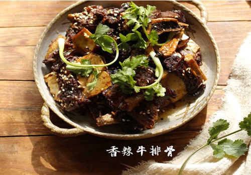 香辣牛排骨的介绍:在制作这道美味之前,我花费了大量的时间去寻找食材,去了几个超市都没有买到牛排骨,最后还是到了市场上才买到的牛排骨,又花了大量的时间去腌制牛排骨,为的就是吃起来非常的美味,在炒制的过程中,我加入了大量的辣椒和花椒粒,吃起来麻辣鲜香是主要的味道,为了牛肉吃起来更加的紧实,我在放油炒制的过程中,将将牛排骨煸制了一段时间,这样吃起来更香。
