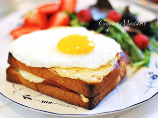 库克太太三明治酥脆面包夹着咸鲜火腿,覆上浓浓瑞士起司及牵丝白酱,细小的芥末籽咬起来饶富趣味,软嫩酥脆全部到位,加码再来个爆浆太阳蛋,熔岩般流泻的蛋黄简直犯规到了顶点~