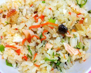 鲑鱼炒饭,还在担心隔夜菜吃不完该怎么办吗?就把昨夜吃剩的鲑鱼和隔夜饭拿来做炒饭吧!好吃爽口,大家快来试试吧!