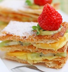 今天的这款甜点名字很有意思--水果千层酥。不要顾名思义认为这个东西叫千层酥就一定会有很多层,其实主体只有三层,叫它千层派,是因为那三层派皮使用的是烘培中常用的“千层酥皮”。