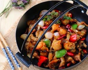 干锅牛蛙,蛙肉鲜嫩甜美,口感非常的好。相信很多吃过蛙肉的人们来说,都很难忘怀,但是蛙肉含有寄生虫,要用高温多煮会,就可以放心使用了哦!