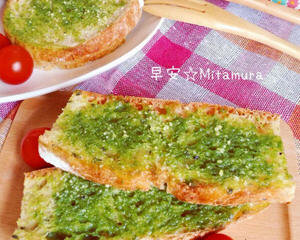 紫苏青酱香烤面包,紫苏富含矿物质和维生素,具有很好的抗炎作用,而且可为其他食品保鲜和杀菌,用紫苏做出来的青酱,香气十足,而且清爽可口,涂在面包上或是做成义大利面等都是美味满点喔。