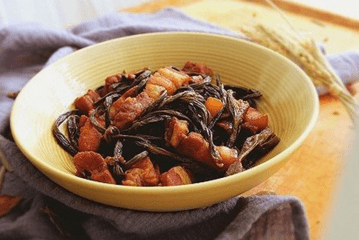 干豆角的做法是和五花肉一起炖制,使每一根豆角都包裹着肉的香气,十分诱人。
