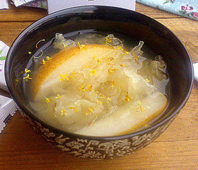 蜂蜜桂花双雪羹是一道集美容养颜与美味于一身的美味美食,将雪耳、雪梨同煮吃起来既有雪梨的清嫩甘甜又有雪耳的软滑适口,再加上蜂蜜,桂花,芳香四溢,甘甜美味。