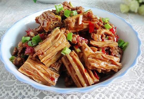 肉末剁椒腐竹介绍:这道肉末剁椒腐竹是将腐竹和肉末、剁椒搭配在一起炒制而成的一道菜肴,腐竹吸收了肉末的鲜美和油脂、剁椒的咸辣有味,吃起来非常的惹人喜爱。 肉末剁椒腐竹的做法请看下面地铺行网的讲解。