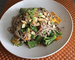 杏仁酱荞麦面,杏仁酱与花生酱有类似的营养成分,但较为不甜,含有稍高的维他命E及矿物质,杏仁可降低胆固醇,荞麦面及蔬菜则提供了纤维质,一道健康营养的简单料理。原食谱是用全麦面,但因家中有许多荞麦面,所以改用荞麦面,营养成分不减分哦。