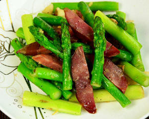 这道芦笋炒腊肠的做法非常简单,而且营养也特别丰富。今天做腊肠,为了炒着方便,我先蒸熟了。要配芦笋,本想切条的,怕这样切肉会散,就切了一半的条,一半的片。切的时候就感觉到肉质非常紧实,炒好后条的也一点不散。