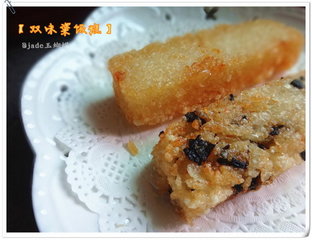 双拼粢饭糕介绍 双拼粢饭糕在家里做还是比较的简单,吃起来,也让人感觉比较的文雅,有时候这款点心可以用吃剩下的米饭来制作,这里我用的是新鲜的,而且加入了紫菜和虾皮,使这道菜吃起来更加的鲜美,外酥里嫩,口感非常的棒,一起学习制作下吧!
