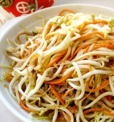 胡萝卜豆芽炒肉丝介绍:胡萝卜豆芽炒肉丝主要取材于胡萝卜、豆芽、猪肉这三种食材,这里将胡萝卜、豆芽与猪肉搭配着一起炒制,胡萝卜是清脆微甜的味道,豆芽是清新脆嫩的味道,这两种都非常解腻的食材和猪肉搭配,不仅使得猪肉吃起来更加的美味,而且还可以帮助猪肉在身体内的吸收消化,平衡营养,甚是不错。