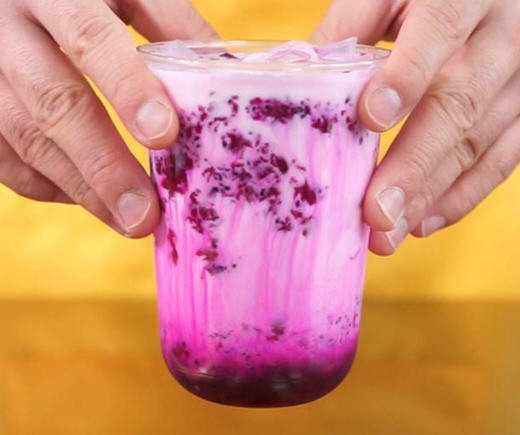 脏脏茶是爆红网络一款冷饮,它的做法最大好处就是水果口味可以随意改进,现在地铺行网用火龙果做一款脏脏茶,方法特别简单,先把火龙果肉压成泥,然后有牛奶,淡奶油混合即可。