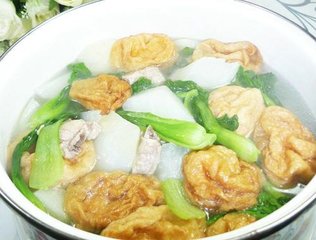 大杂萝卜汤中汤水喝起来鲜美中不失清新,鲜美的排骨和清新多汁的萝卜同煮,另外还加了鸡毛菜(小白菜)和油面筋,口感丰富,所加的调料也很少,满满的都是食材的原汁原味。