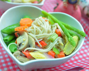 奶油蘑菇面,小朋友喜爱吃奶油义大利面,但义大利面口感较硬,担心孩子没有细嚼慢咽容易消化不良,其实换成口感更Q软的五木细关东面,并使用各类的颜色蔬菜切丁与香浓奶油拌炒后,让孩子吃的更放心与开心!