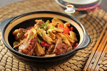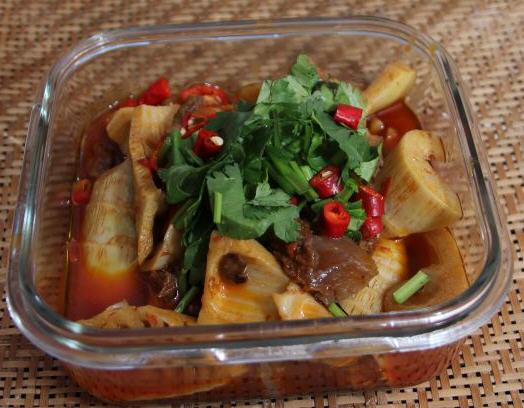 笋子烧牛肉介绍:笋子烧牛肉是一道香辣爽口的菜肴,喜欢吃辣的朋友可要看过来啦,这道菜肴一定会让你吃的直呼过瘾,它的辣主要体现在几个方面:一,火锅底用油划开辣味十足。二,火锅底化开后加入豆瓣酱一起炒,增辣味。三,在出锅之前放入了香辣的小米椒,辣味十足。并且这里的主材料选择的是牛肉和笋子搭配,清新和鲜美搭配,再加上香辣的味道,真的是很惹人食欲。
