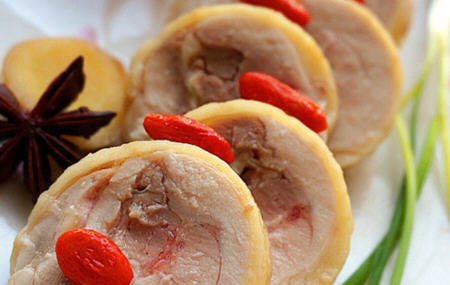 枸杞花雕鸡卷介绍:枸杞花雕鸡卷乍一看上去很像卤猪蹄,但吃在嘴里的口感和风味就完全不同了。这是一款将鸡腿经过先卤再浸泡的方式加工出来的凉拌小菜。卤料使鸡肉变得有卤香味儿,糟卤和花雕使鸡肉带上了醇厚的酒香,闻着醉人,吃了更令人陶醉。