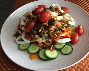 五味鱿鱼,简单而无油烟的料理。特别之处在于酱汁的调配,酸甜适中,微微的辣,既有白醋的酸也有黑醋的香,是一道适合夏天食用的清爽料理。