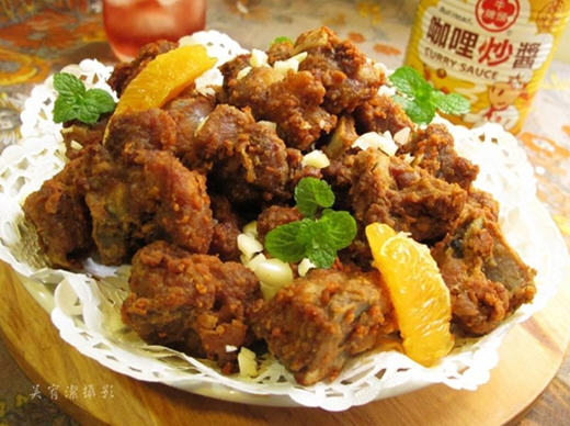 咖喱排骨酥介绍 咖喱排骨酥口感外酥内嫩,咸香好滋味,制作时当排骨表面炸至固定成形后,时不时要用锅铲推一下底部,避免肉块沉底造成焦黑就不好看了。
