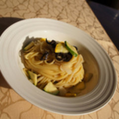 地道的意大利面都很有咬劲,也就是煮得半生不熟,咬起来感觉有点硬的状态,是西餐品种中最接近中国人饮食习惯的。金黄爽滑的意大利面嚼劲十足,配以时令新鲜蔬菜,节瓜增加脆感的同时,更增加黑橄榄浓郁的香味。