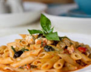 黑橄榄茄汁鸡肉斜管面,黑橄榄有股特殊的风味,经常运用在义式料理上,这道茄汁鸡肉斜管面特别加入了黑橄榄来料理,感觉风味极为强烈,所以加多加少可依自己口味来定量。