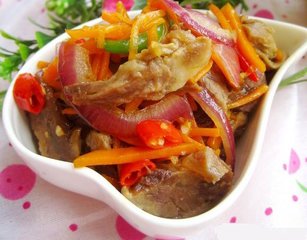 胡萝卜丝炒羊肉的做法是将两种都带有甜味的食材胡萝卜和洋葱搭配着羊肉一起炒制,清新的甜味正好可以去除羊肉身上的膻味,还可以为其增味,很是美味。