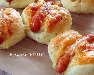 热狗起司面包,是利用直接法制作的。面团揉进奶油和综合香草,香气十足,再摆上一条小热狗,上面撒满起司丝,烘烤20分钟,真是香喷喷,美味百分百。成型也超简单的,非常适合初学烘焙或是懒的成型的朋友哦。