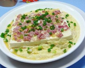 这道培根鸡蛋蒸豆腐的做法特别简单,而且营养也非常丰富。豆腐的吃法很多,可以单独成菜,还可以和其它食材搭配进行烹饪哦。鸡蛋与内脂豆腐真是完美的搭配,蒸好的鸡蛋豆腐,入口即化。很适合老人和孩童食用,加入了肉末与香菇,使整个菜又增色不少。