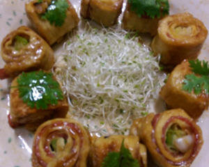 培根葱花卷,为了让孩子们多吃点豆类产品,增加蛋白质的摄取,今天特地以新鲜豆包卷孩子们都喜欢的培根与葱段,佐带甜味的烤肉酱,真的很美味。又是一道适合带便当的简单美味料理。