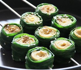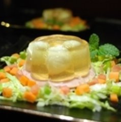 晶莹剔透的果冻裹着洁白的鸡蛋与粉红的火腿,犹如美丽的水晶球,在红红绿绿的蔬果衬托下更显艳丽夺目,让人不忍下口。甜品入口有着果冻QQ的口感,混杂着火腿与蛋的香味,清新宜人。