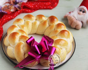 这圣诞的脚步越来越近了,圣诞气氛也越来越浓了。今天将面包辫成4股辫子,装饰上蝴蝶结。围起来组成一个漂亮的圣诞花环面包。怎么样,是不是很喜庆、很有节日的气氛呢?非常喜欢它的立体感。