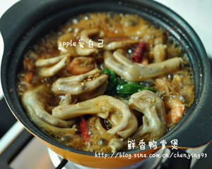 鲜香啤酒鸭掌煲是我以前经常去的一家餐馆招牌菜鸭掌煲,每次去吃都要点的。今天就自己在家做一下这道啤酒鸭掌煲,餐厅里的没有虾,我给放了虾一起炖,虾跟鸭掌的组合,连作为配角出场的虾也变得好好吃。