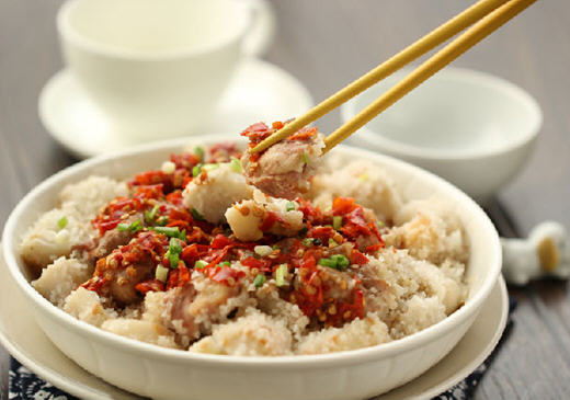 粉蒸萝卜条味道咸辣微酸、做法简单,有清热祛火的功效,适合全家人食用。也可用此健康美食佐膳作食疗。