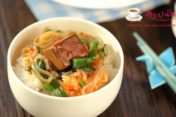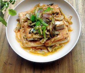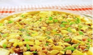 此菜是在豆腐经烹烧后,再把经煽炒的肉茸浇在豆腐上,鲜嫩味美,很不错的一道下饭菜。