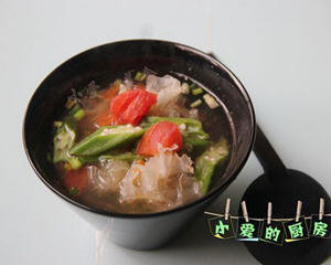 这个银耳番茄秋葵汤的做法特别简单,而且营养也非常丰富。秋葵含水量高,脂肪很少,很适合想要减肥瘦身的女士,而且它富含的维生素C和膳食纤维,还能使皮肤嫩白。银耳又有益气清肠、滋阴润肺的作用。银耳富有天然植物性胶质,外加其具有滋阴的作用,是可以长期服用的良好润肤食品。