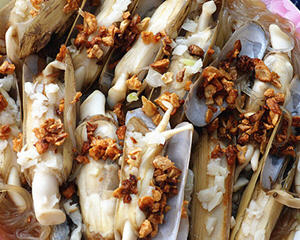 这道蒜香粉丝蒸鲜蛏的做法特别简单,而且营养价值还非常丰富。接着做蛏子菜,蒜末经过炸制味道太棒了,去除了大蒜的异味,只有香味。所以凡是用到蒜蓉的菜品,到最后我都要撒上金蒜末提香。这也算我家私房菜的特色哦。