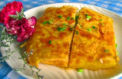 三鲜豆皮的介绍:三鲜豆皮是武汉民间的一种传统小吃。豆皮制作过程中,要求“皮薄、浆清、火功正”,这样煎出的豆皮外脆内软、油而不腻。三鲜豆皮是以馅中有鲜肉、鲜蛋、鲜虾而得名。老通城的三鲜豆皮远近闻名,这里的三鲜豆皮不仅馅中有肉、蛋、虾仁,还有猪心、猪肚、冬菇、玉兰片、叉烧肉等,制馅讲究,煎制精细,煎好后油光闪亮,色黄味香。