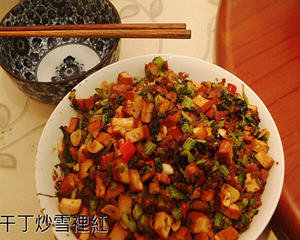 雪里红辣炒干丁,制作简单快捷,但菜色菜香,一应俱全。开胃,爽口下饭。咸香辣口让人白饭一碗接一碗,也是米饭的好搭档!