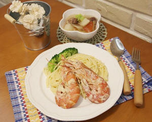 红虾起士义大利面,红虾搭配奶香十足的起士酱,吸附着起士奶香的天使红虾好诱人,香浓可口。而且面条也是浓郁的很呢!是不是很勾引食欲,那还等什么?快来试试吧!