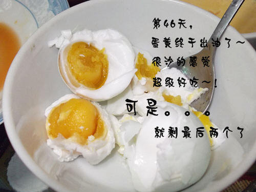 在家自己做咸鸭蛋简单又美味,今天地铺行网用古老式的盐水浸泡法来做一款自制咸鸭蛋,蛋黄出油,口感纯正,非常好吃的,下面给出了整个制作详细流程图,包含19天主46天的效果对比图,一般需要腌制46天蛋黄才会出油哟。