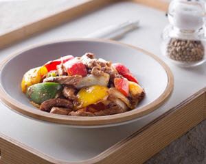 沙茶三色椒炒肉丝,是属于一道健康美食,而且材料全都是易买又易煮的。其中三色椒含丰富维他命C和胡萝卜素,能高效抗氧化;叶绿素更有助排出坏胆固醇。配合沙茶酱同煮,味道香浓营养又高。