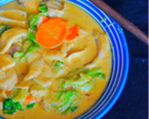 蔬菜黄咖喱的制作方式: 1.泰国黄咖喱酱,(这个淘宝,或者东南亚那种超市都可以买到) 2.椰浆用自己喜欢的牌子就可以 3。锅中放入适量油,放入咖喱酱,炒出香味,之后加入椰浆,和牛奶,烧开之后,转成中小火,加入糖,