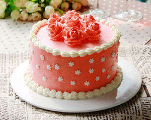 这个爱恋蛋糕的做法非常简单,是用代表爱情的玫瑰来预热我们中国人的情人节吧。今天用这款裱花蛋糕就是用戚风蛋糕做胚,本来想做出红玫瑰的效果,用的大 红色的色素,滴了几滴,但好象调出来的颜色并不是那么红,就用这种颜色了。这个蛋糕红色是喜庆的颜色,也是代表热情和爱的颜色,所以我就叫它爱恋蛋糕了。