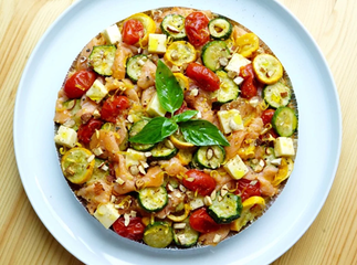 烟熏鲑鱼蔬菜洋芋塔咸香的起司洋芋塔上铺满烟熏鲑鱼及烤蔬菜,丰富的口感中带着淡淡的柠檬香气,美味又兼具饱足感的欧风料理,鲑鱼肉有补虚劳、健脾胃、暖胃和中的功能;可治消瘦、水肿、消化不良等症。