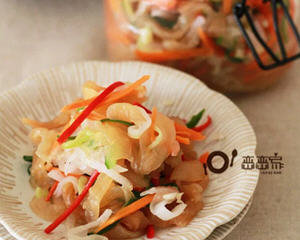 凉拌海蜇皮,说它是宴席第一菜绝对不夸张,凉拌海蜇皮是许多人参加大小宴席不容错过的凉拌拚盘的要角,凉拌后的海蜇皮越放会越入味,而且弹性不减,所以可以一次多做一些,放在冰箱里,就是可以夏日的方便常备菜了。