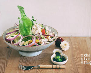 黑芝麻鸡肉沙拉,从冰箱里拿出五彩缤纷的蔬菜,用蔬果洗洁液一下子洗净;烧锅热水,烫块鸡胸肉,或切或撕,三两下就能上桌一到健康美味的黑芝麻鸡肉沙拉了,你还在等什么?还不快来试试!