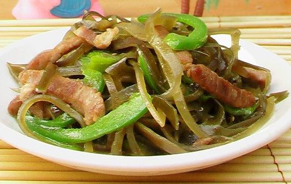 青椒海带肉丝介绍 青椒海带肉丝是一道做法简单的家常菜,海带是一种营养价值极高的美味食材,并且含有丰富的碘和钙,是一种老少皆宜的美食,可以降血压、预防骨质疏松。将海带和瘦肉搭配在一起做成的这道青椒海带肉丝做起来没有什么难度可言,就是需要注意炒制的时间不可过长,否则这道菜肴吃起来口感就会变了,另外调料也不需要多加,清淡点更好吃。