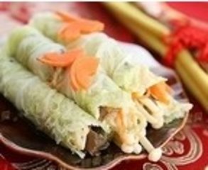 翠嫩欲滴的白菜包裹着甜脆的胡萝卜、爽脆的木耳,嫩滑的金针菇,口感十分丰富。