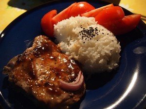 4、将猪排放入烤盘中沾上油,用刷子将第三步的混合物均匀涂满两面(用洒的也没问题!)在处理好的猪排上酌量浇上酱油、酒、烤肉酱和蜂蜜。