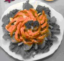4、生菜叶垫碟,排上西柚片、鳄梨片及素虾仁即成。沙律酱伴食,番芫荽装饰。[/color]